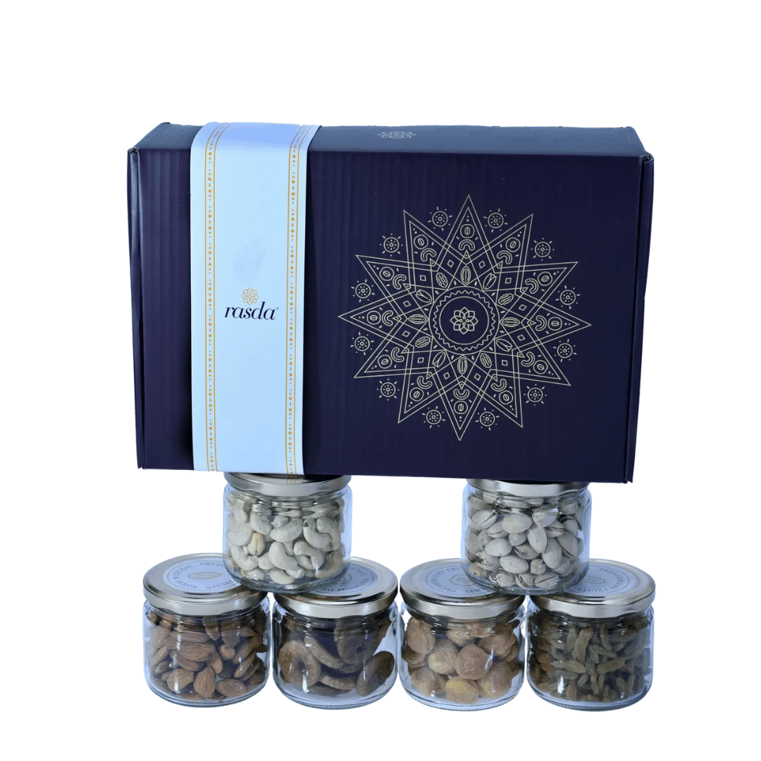Gift loved ones the goodness of premium quality Ruchi Premium Gift Box. Filled with of the finest selection of dry fruits. Ruchi premium gift box contains 150g each of Almonds, Cashew Nuts, Raisins, Salted Pistachios, Dried Figs and Dried Apricots in Glass Jars.