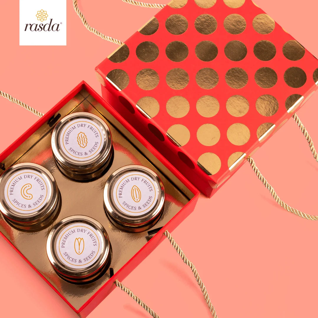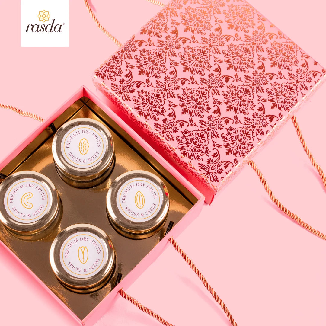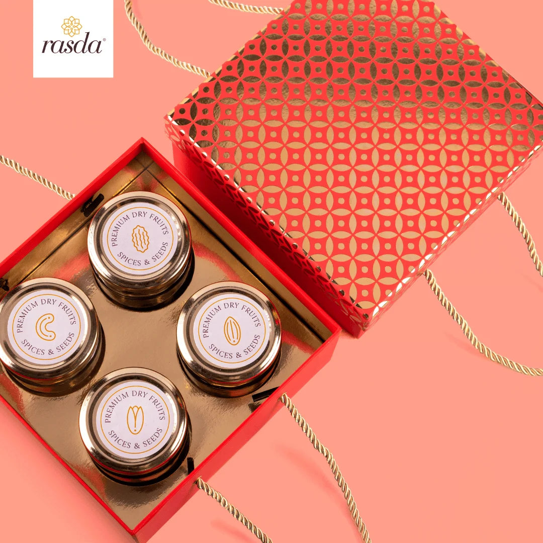 Rucya gift box with handle features a thoughtful blend of 100g each of Almonds, Cashew Nuts, and Raisins, along with 80g of delectable Salted Pistachios, all neatly presented in elegant glass jars.