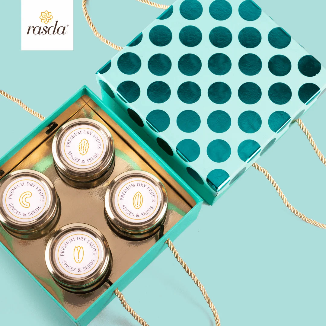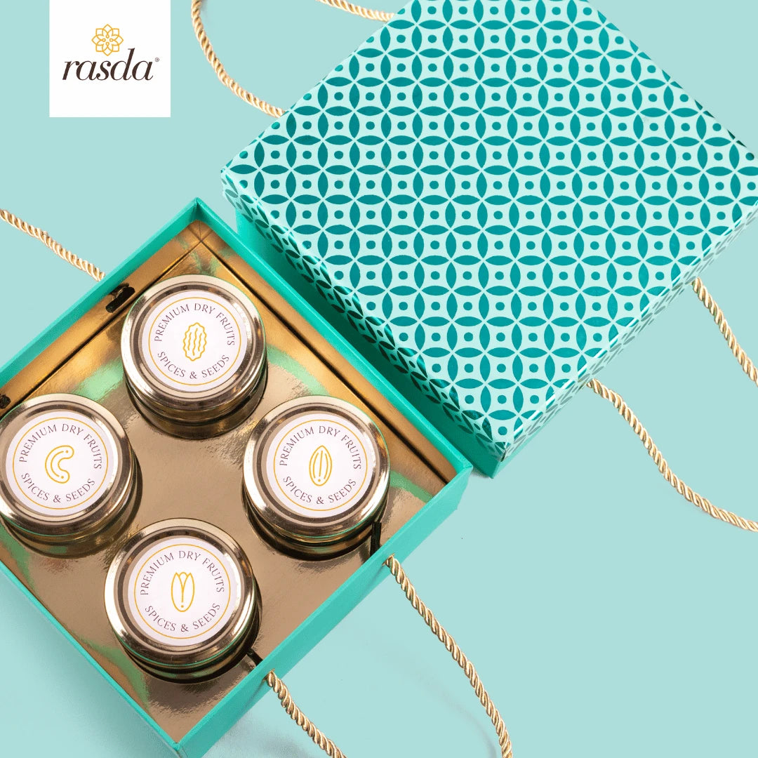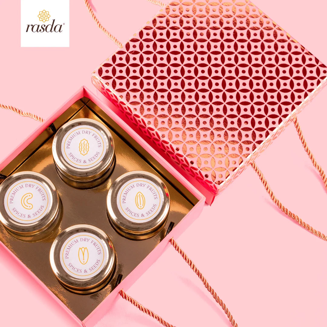 Rucya gift box with handle features a thoughtful blend of 100g each of Almonds, Cashew Nuts, and Raisins, along with 80g of delectable Salted Pistachios, all neatly presented in elegant glass jars.