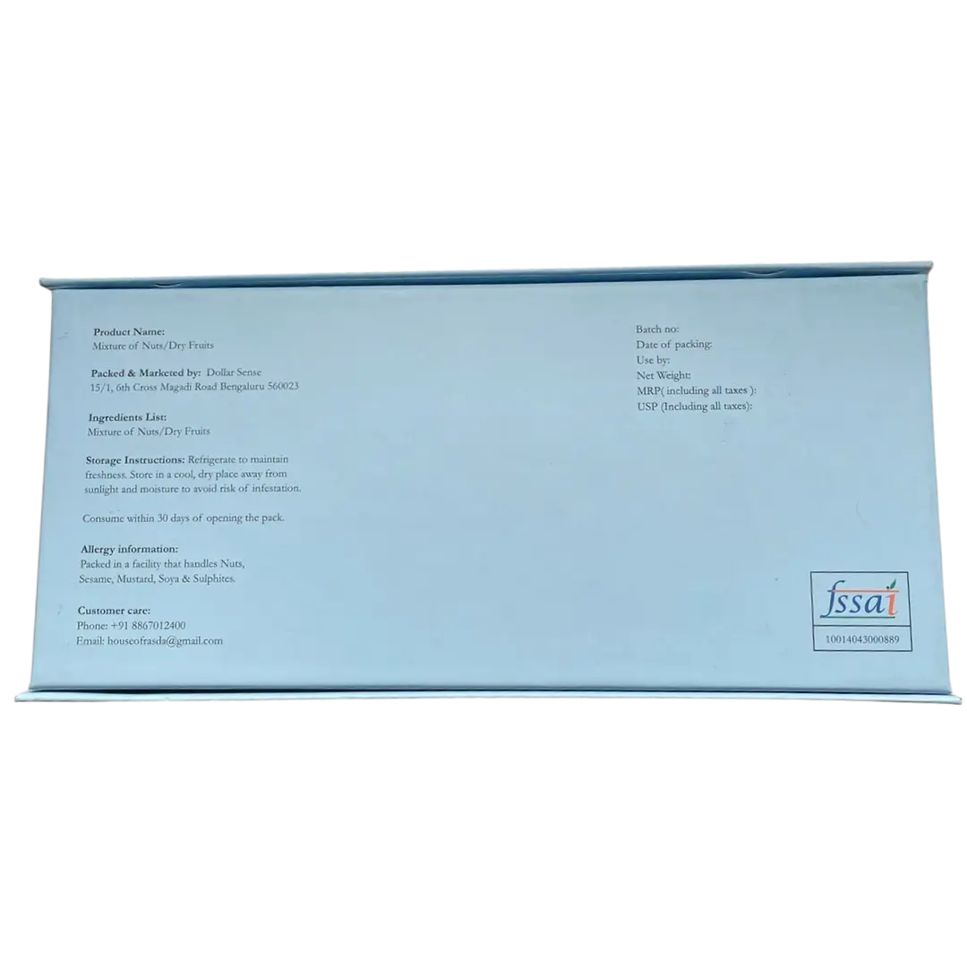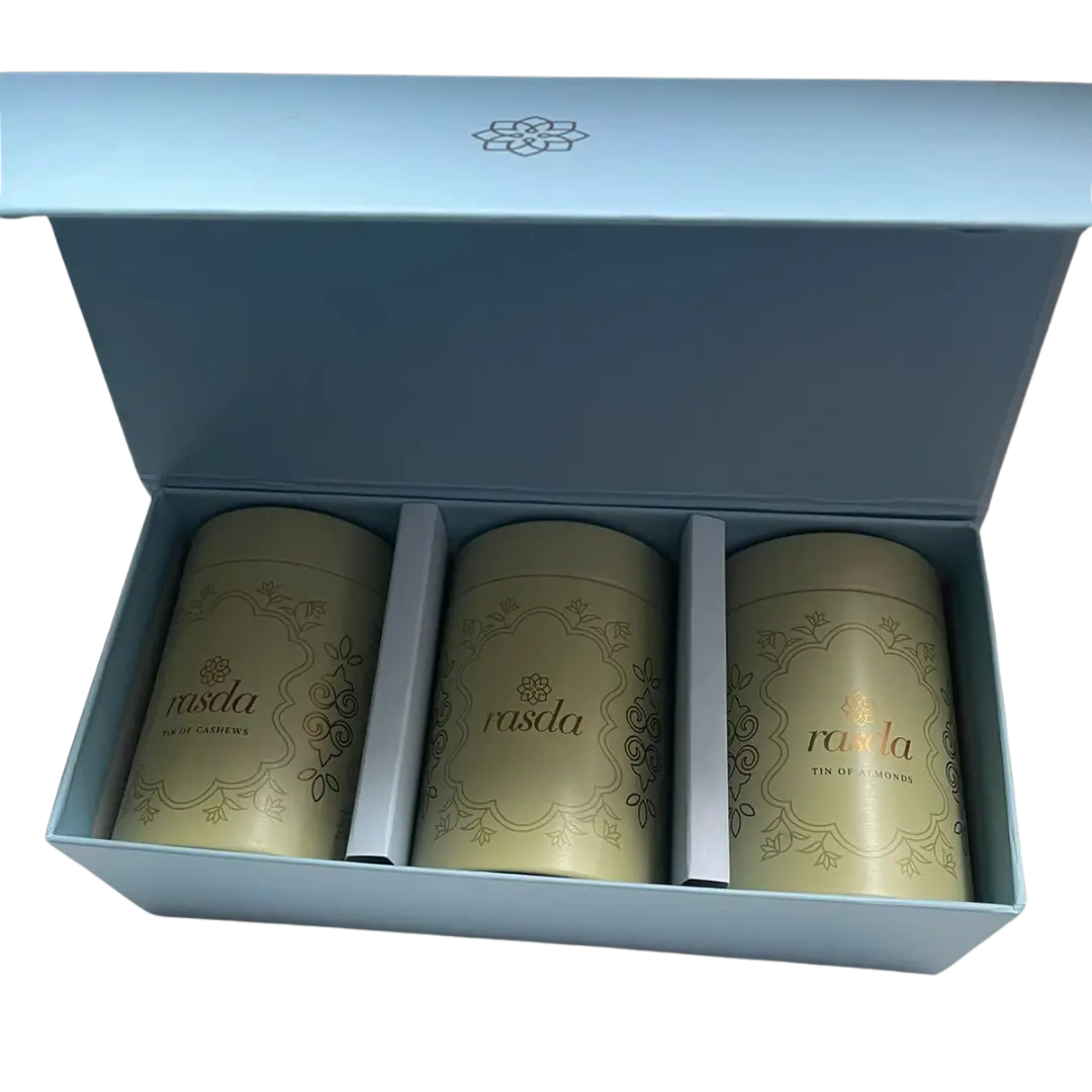 The Rasda Soulful & Spiritual – Premium Dry Fruit Gift Boxes is crafted to celebrate joy, health, and elegance, making it an ideal choice for festive gifting, weddings, and corporate occasions. Each gift box features three designer 150g tins of premium dry fruits and nuts, beautifully presented in a luxury corrugated box with gold foiling and a magnetic opening. The tins come with airtight rubber-sealed lids to preserve freshness and are reusable, ensuring value beyond the celebration. Offered in standard premium combinations with the option to customize assortments, the Soulful & Spiritual Collection makes every occasion truly memorable.